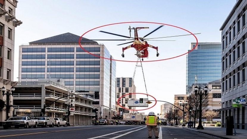 ويُظهر الفيديو كيف أوقفت الشرطة المرور في الشارع؛ بينما كانت المروحية ترتفع حاملة مكيف هواء ضخم يُستخدم لتبريد ماكينات المصانع.